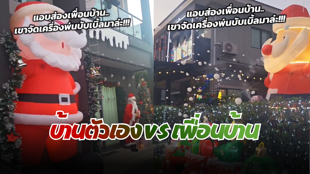 ผู้ใช้ Instagram @athipat.clas โพสต์คลิปเพื่อนบ้านจัดธีมวันคริสต์มาส อื้อหือจัดเต็มเล่นใหญ่เว่อร์ ซานตาคลอสยักษ์เอย ไฟวิบวับเอย ล่าสุด มีเครื่องพ่นบับเบิ้ลด้วย ตอนแรกคิดว่าบ้านตัวเองเล่นใหญ่แล้ว แต่เพื่อนบ้านเล่นใหญ่กว่า ไม่ต้องไปที่ห้างหรือคาเฟ่ข้างนอกแล้วถ้าจะจัดขนาดนี้