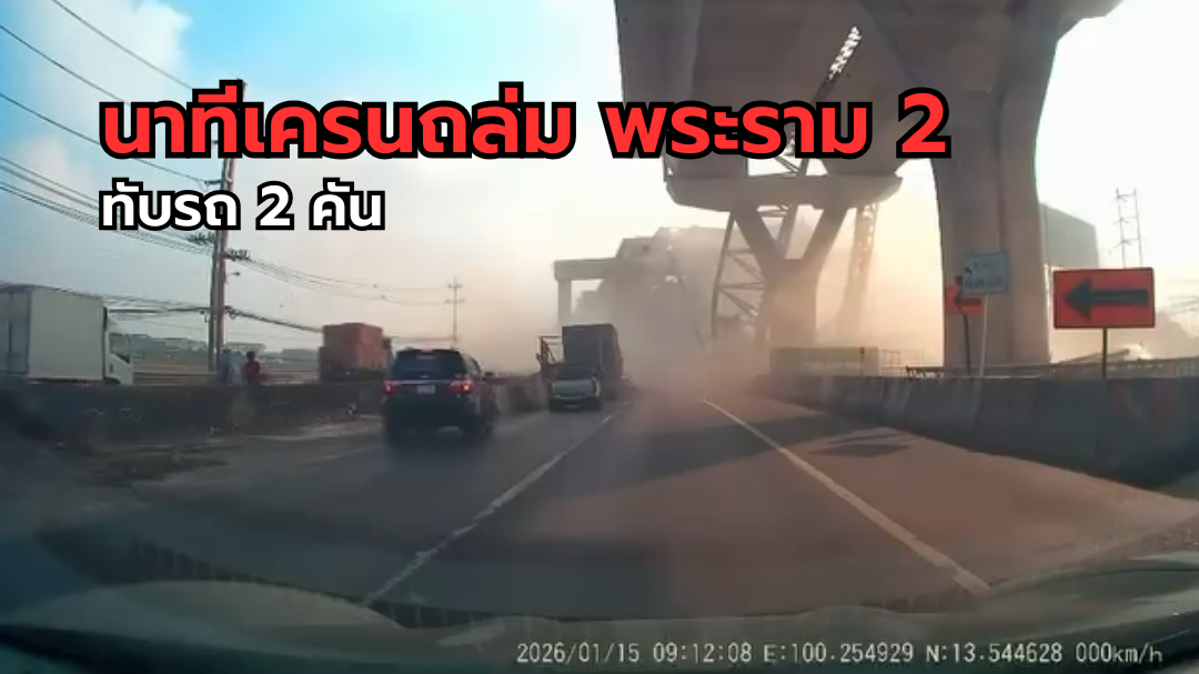 คลิปจากกล้องหน้ารถ Facebook Real Champ เผยให้เห็นนาทีอุบัติเหตุเครนถล่ม บริเวณถนนพระราม 2 ขาออก หน้าโรงแรมปารีส เมื่อวันที่ 15 ม.ค. 2569 เวลา 09.11 น. เป็นเหตุให้มีรถถูกทับ 2 คัน และมีรายงานผู้เสียชีวิตในที่เกิดเหตุ