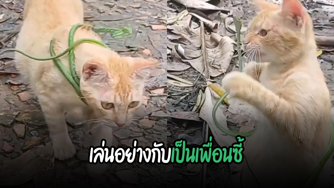 ผู้ใช้ TikTok @hs3srs โพสต์คลิปเจ้าแมวส้มน้อยจับงูเขียวหัวจิ้งจกมาเล่น ทาสแมวมาเห็นลุ้นกันใจหายใจคว่ำ เล่นอย่างกับเป็นเพื่อนซี้กันเลย