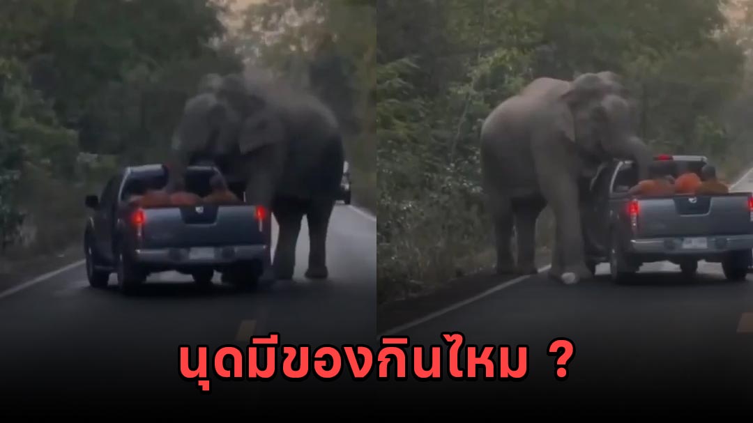 คลิปเหตุการณ์สุดระทึก เมื่อกระบะคันหนึ่งที่มีพระสงฆ์นั่งท้ายมาเจอช้างป่าเขาใหญ่ออกมายืนขวางในระยะกระชั้นชิดเพื่อหาของกิน วินาทีนี้ลุ้นกันใจหายใจคว่ำ