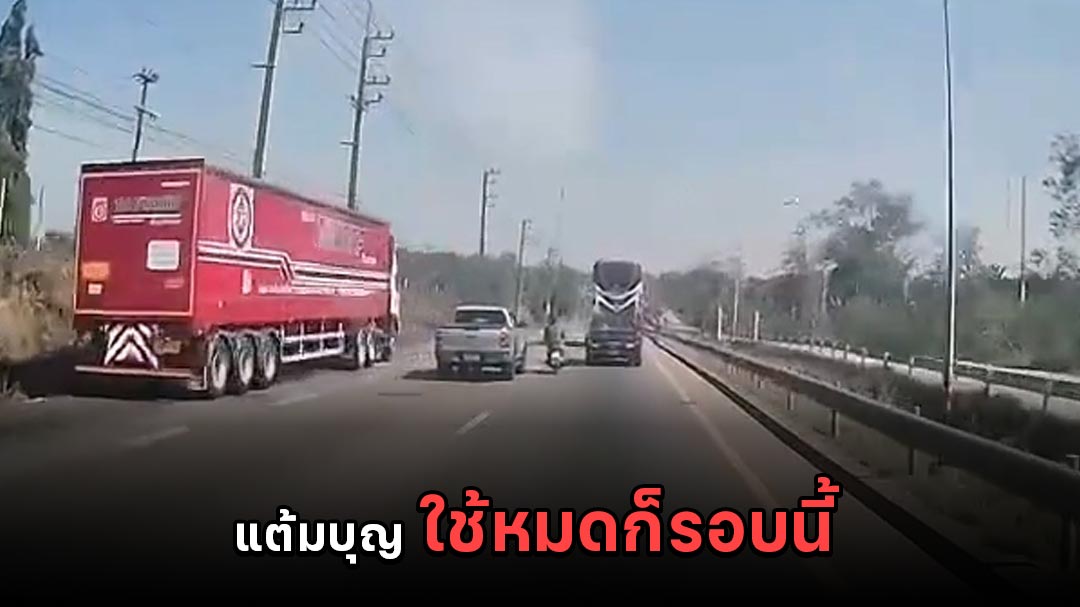 อุบัติเหตุวันที่ 7 ก.พ. 69 เวลาประมาณ 10.20 น. มอเตอร์ไซค์เปลี่ยนเลนออกซ้ายไม่ระวังรถหลัง กระบะกำลังเร่งแซงเฉี่ยวชนล้มกลิ้ง รถตามหลังต้องเบรกตัวโก่งหลบกันระทึก