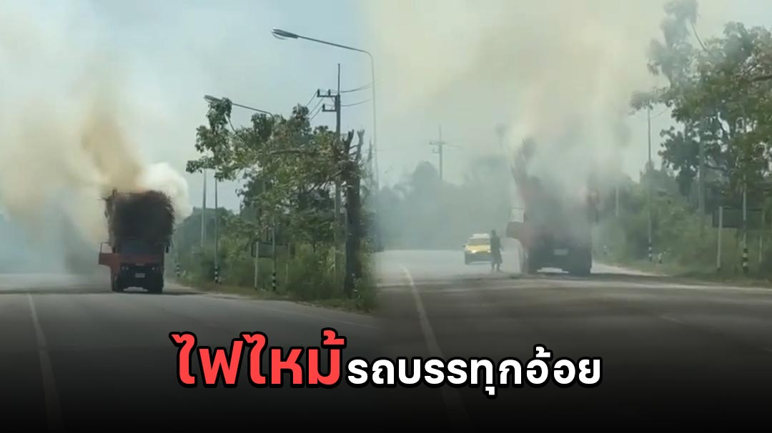 ระทึกทั้งถนน รถบรรทุกอ้อยคันหนึ่งเกิดไฟไหม้ควันโขมง ไฟไหม้อ้อยบนหลังรถลุกลามเร็วมาก แต่ทางคนขับยังสติดี ตัดสินใจยกดัมพ์เทอ้อยทิ้งเพื่อไม่ให้ไฟลามไหม้รถ