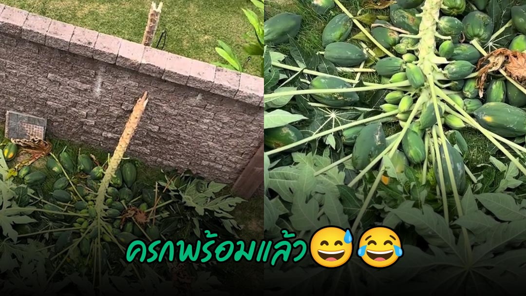 ผู้ใช้ TikTok @wannapornfashion โพสต์คลิป ต้นมะละกอเพื่อนบ้าน หักลงมาฝั่งบ้านตัวเอง มะละกอลูกดกมาก ทางนี้เห็นแล้วแบบว่า ครกนี่พร้อมเลย