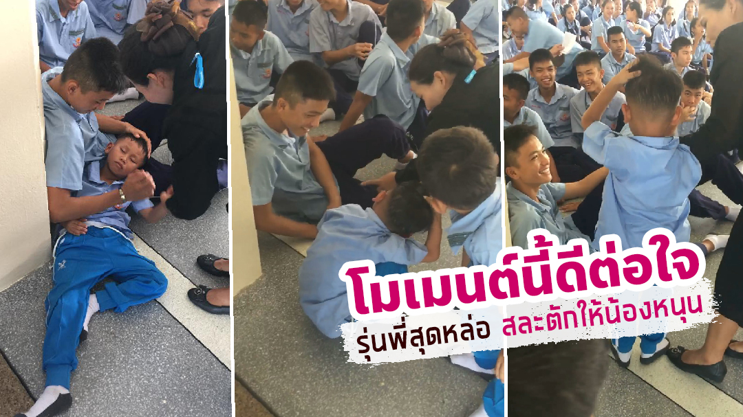 ชอตนี้ชาวเน็ตต้องปรบมือให้ น้อง ป.1 หลับขณะที่กำลังฝึกซ้อมกิจกรรมวันไหว้ครู พี่ ม.3 ที่นั่งข้าง ๆ เลยก็เอาตักตัวเองมาเป็นหมอนให้น้องนอน จนเลิกซ้อม โมเมนต์นี้ดีต่อใจจริง ๆ