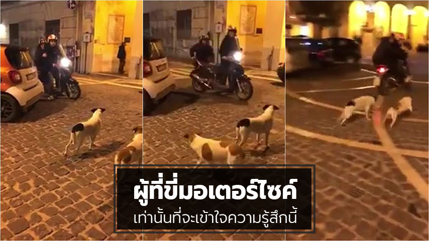 สองนักขี่มอเตอร์ไซค์ขับรถมาเจอสุนัขสองตัวเจ้าถิ่นอยู่บนถนนตั้งท่าพร้อมจะไล่ล่าคนที่ขับรถผ่าน อย่างไรก็ตามพฤติกรรมของสุนัขสองตัวนี้อาจเป็นอันตรายต่อมันเองและคนขับรถซึ่งอาจทำให้เกิดอุบัติเหตุได้
