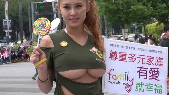รายงานระบุว่า ภาพการรณรงค์ดังกล่าวมีขึ้นเมื่อวันที่ 16 มีนาคมที่ผ่านมา โดย หม่า โหย่วหรง นางแบบสาวเซ็กซี่ได้ออกเดินสายโชว์สองเต้าลูกมะพร้าวบนถนนในกรุงไทเปของไต้หวัน พร้อมกับชูป้ายรณรงค์ให้สิทธิแก่กลุ่มรักร่วมเพศทั้งเกย์และเลสเบี้ยน เพื่อลดความปัญหาความรุนแรงในครอบครัวและสร้างความเข้าใจแก่สังคม