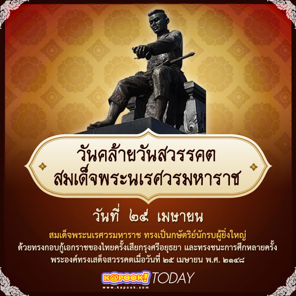 25 เมษายน วันคล้ายวันสวรรคตสมเด็จพระนเรศวรมหาราช ร่วมรำลึกถึงพระมหากรุณาธิคุณแห่งองค์สมเด็จพระนเรศวรมหาราช ผู้ทรงกอบกู้อิสรภาพของไทย