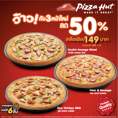 พิซซ่าฮัท ขอเสนอโปรโมชั่นสุดคุ้มกับ พิซซ่า 3 หน้าใหม่ ลดทันที 50% เหลือเพียงถาดละ 149.- ให้คุณอร่อยเต็มคุณภาพกับพิซซ่าแป้งหนานุ่มถาดกลาง3 หน้าใหม่ แฮมแอนด์ซอสเซจ, ดับเบิ้ล ซอสเซจ มิกซ์ และ ดูโอ้ ชิกเก้น บาร์บีคิว รสเข้มเต็มเครื่อง อร่อยคุ้ม 50% ได้แล้ววันนี้ - วันที่ 5 มิ.ย. 57 ที่ พิซซ่า ฮัท โทร 1150 หรือดูเงื่อนไขเพิ่มเติมและสั่งออนไลน์ที่ www.pizzhut.co.th