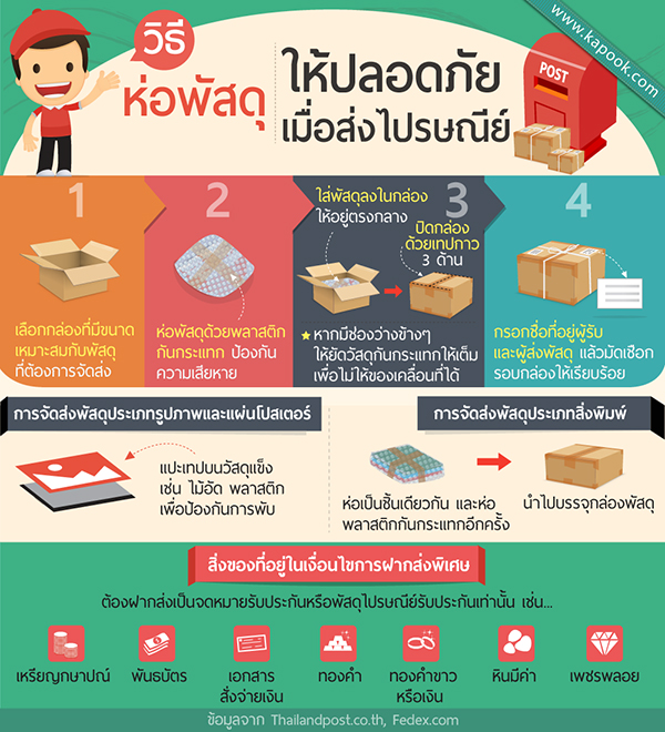 วิธีห่อพัสดุส่งไปรษณีย์ ของแบบไหนห่ออย่างไร ให้ปลอดภัย รวมถึงสิ่งของที่ห้ามส่งไปรษณีย์ มาดูกันว่า พัสดุอะไรบ้างจัดเป็นของต้องห้าม เพื่อเป็นการป้องกันพัสดุให้ส่งถึงปลายทางอย่างปลอดภัย วันนี้เรามีวิธีการห่อพัสดุส่งไปรษณีย์มาฝากกัน ใครจะส่งของอะไรถึงคนไกล ลองมาดูวิธีส่งของแต่ละประเภทกันเลยจ้า