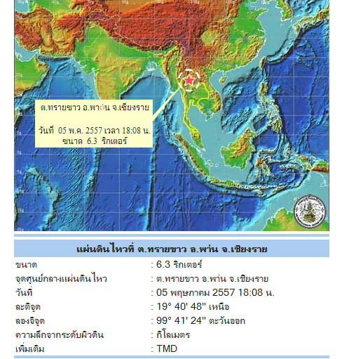 เมื่อเวลาประมาณ 18.08 น. ของวันนี้ (5 พฤษภาคม 2557) ผู้สื่อข่าวรายงานว่า เกิดเหตุแผ่นดินไหวในจังหวัดเชียงรายและพื้นที่ใกล้เคียง เช่น จ.ลำปาง จ.เชียงใหม่ จ.พะเยา วัดแรงสั่นสะเทือน (อ้างอิงจาก กรมอุตุนิยมวิทยา) ได้ 6.3 แมกนิจูด ศูนย์กลางอยู่ที่ อ.พาน จ.เชียงราย ไม่ไกลวัดร่องขุ่น ณ ความลึก 7.4 กิโลเมตร ทั้งนี้ แรงสั่นสะเทือนดังกล่าว ผู้ที่อยู่ตึกสูงในกรุงเทพฯ ก็รับรู้แรงสั่นสะเทือนด้วย