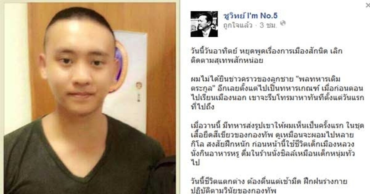 เมื่อวานนี้ มีทหารส่งรูปเขาให้ผมเห็นเป็นครั้งแรก ในชุดเสื้อยืดสีเขียวของกองทัพ ดูเหมือนจะผอมไปหลายกิโล สงสัยฝึกหนัก ก่อนหน้านี้ใช้ชีวิตเด็กเมืองหลวง นั่งกินอาหารหรู ดื่มในร้านนั่งชิลล์เหมือนเด็กหนุ่มทั่วไป