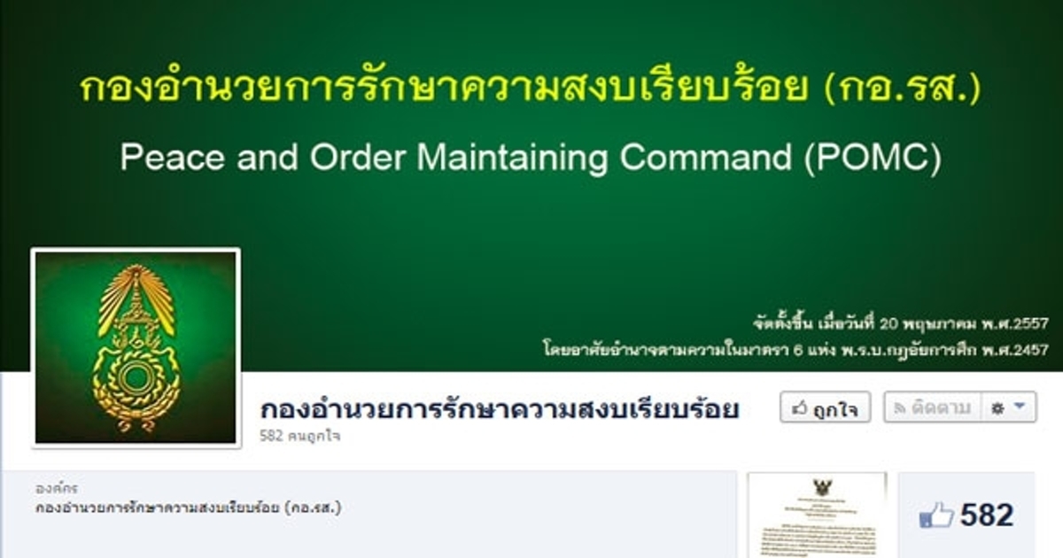 วันนี้ (22 พฤษภาคม 2557) ที่เฟซบุ๊ก Wassana Nanuamk ของ น.ส.วาสนา นาน่วม ผู้สื่อข่าวสายทหาร มีการโพสต์ภาพและข้อความว่า กองอำนวยการรักษาความสงบเรียบร้อย (กอ.รส.) ได้มีการเปิดแฟนเพจในเฟซบุ๊กอย่างเป็นทางการ โดยใช้ชื่อว่า กองอำนวยการรักษาความสงบเรียบร้อย เพื่อใช้ในการประกาศแจ้งข่าวสารสู่สื่อมวลชนและประชาชนในโลกออนไลน์ พร้อมระบุว่าแฟนเพจที่ปรากฏอื่น ๆ นั้น เป็นของปลอม