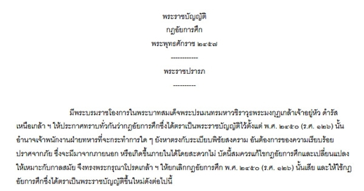 มีพระบรมราชโองการในพระบาทสมเด็จพระปรเมนทรมหาวชิราวุธพระมงกุฎเกล้าเจ้าอยู่หัว ดำรัสเหนือเกล้าฯ ให้ประกาศทราบทั่วกันว่า กฎอัยการศึกซึ่งได้ตราเป็นพระราชบัญญัติไว้ตั้งแต่ พ.ศ. 2450 (ร.ศ. 126) นั้น อำนาจเจ้าพนักงานฝ่ายทหารที่จะกระทำการใด ๆ ยังหาตรงกับระเบียบพิชัยสงคราม อันต้องการของความเรียบร้อยปราศจากภัย ซึ่งจะมีมาจากภายนอก หรือเกิดขึ้นภายในได้โดยสะดวกไม่ บัดนี้ สมควรแก้ไขกฎอัยการศึกและเปลี่ยนแปลงให้เหมาะกับกาลสมัย จึงทรงพระกรุณาโปรดเกล้าฯ ให้ยกเลิกกฎอัยการศึก พ.ศ. 2450 (ร.ศ. 126) นั้นเสีย และให้ใช้กฎอัยการศึกซึ่งได้ตราเป็นพระราชบัญญัติขึ้นใหม่ ดังต่อไปนี้