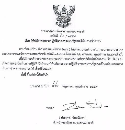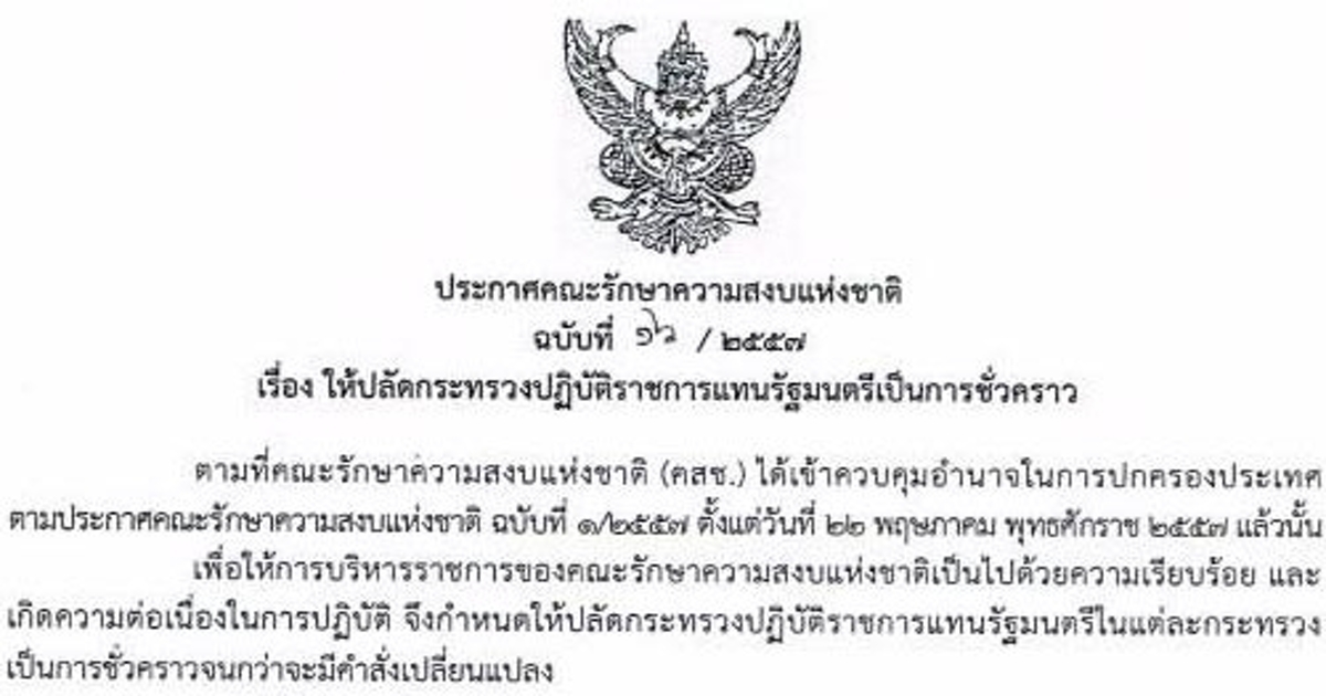 ตามที่คณะรักษาความสงบแห่งชาติ (คสช.) ได้เข้าควบคุมอำนาจในการปกครองประเทศตามประกาศคณะรักษาความสงบเรียบร้อยแห่งชาติ ฉบับที่ 1/2557 ตั้งแต่วันที่ 22 พฤษภาคม 2557 แล้วนั้น เพื่อให้การบริหารราชการของคณะรักษาความสงบเรียบร้อยเป็นไปด้วยความเรียบร้อยและเกิดความต่อเนื่องในการปฏิบัติจึงกำหนดให้ปลัดกระทรวงปฏิบัติราชการแทนรัฐมนตรีในแต่ละกระทรวงในการชั่วคราวจนกว่าจะมีคำสั่งเปลี่ยนแปลง