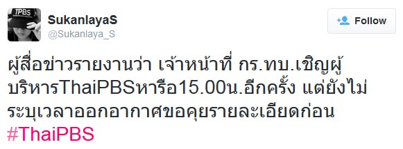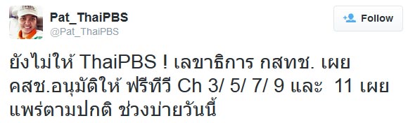 วันที่ 23 พฤษภาคม 2557 เวลาประมาณ 13.05 น. ทวิตเตอร์ของผู้สื่อข่าวไทยพีบีเอส @Pat_ThaiPBS และ @SukanlayaS รายงานว่า นายฐากร ตัณฑสิทธิ์ เลขาธิการ กสทช. เปิดเผยว่า คสช. เตรียมให้สถานีโทรทัศน์ช่อง 3 5 7 9 11 ออกอากาศตามปกติในช่วงบ่ายของวันนี้ (23 พฤษภาคม) ยกเว้นช่อง Thai PBS ที่ต้องเชิญผู้บริหารมาหารืออีกครั้งในเวลา 15.00 น.