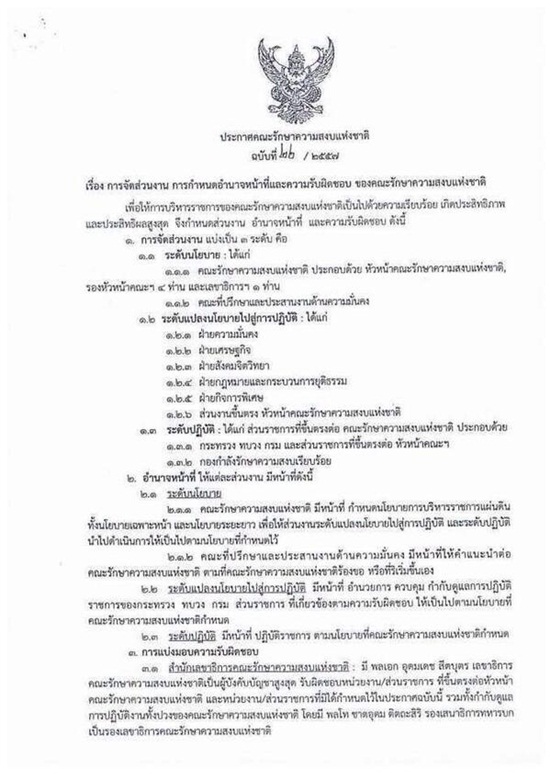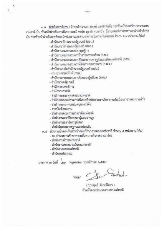6. หน่วยขึ้นตรง พล.อ.ประยุทธ์ จันทร์โอชา ประกอบด้วย กองอำนวยการรักษาความมั่น คงภายในราชอาณาจักร (กอ.รมน.), สำนักงานสภาความมั่นคงแห่งชาติ (สมช.), สำนักข่าวกรองแห่งชาติ, สำนักงบประมาณ, สำนักงานตำรวจแห่งชาติ และกลุ่มงานรักษาความสงบ นอกจากนี้ ยังได้มีการแบ่งกลุ่มงานรักษาความสงบเรียบร้อย ซึ่งขึ้นตรงกับคณะ คสช. โดยมอบหมายให้แม่ทัพภาคของแต่ละภาคเป็นผู้ดูแล