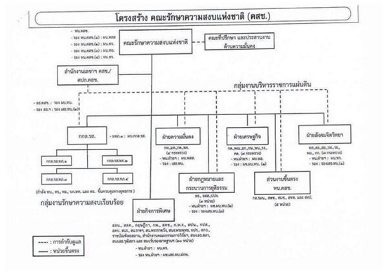 สำนักงบประมาณ, สำนักงานตำรวจแห่งชาติ และกลุ่มงานรักษาความสงบ นอกจากนี้ ยังได้มีการแบ่งกลุ่มงานรักษาความสงบเรียบร้อย ซึ่งขึ้นตรงกับคณะ คสช. โดยมอบหมายให้แม่ทัพภาคของแต่ละภาคเป็นผู้ดูแล