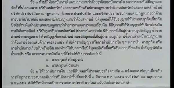 คณะรักษาความสงบแห่งชาติ คสช. ออกคำสั่งฉบับที่ 10 มีคำสั่งอายัดทรัพย์ นายจารุพงศ์ เรืองสุวรรณ และนายจาตุรนต์ ฉายแสง