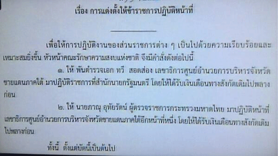 คสช. คำสั่ง ฉบับที่ 11 ย้าย ทวี สอดส่อง เลขา ศอ.บต. นั่งเก้าอี้ที่สำนักนายกรัฐมนตรี ให้ ภาณุ อุทัยรัตน์ อดีตเลขา ศอ.บต ปฏิบัติหน้าที่แทน