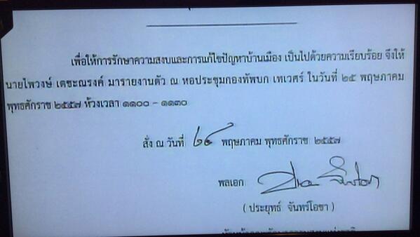 วันนี้ (24 พฤษภาคม 2557) ผู้สื่อข่าวรายงานว่า คณะรักษาความสงบแห่งชาติ (คสช.) ออกคำสั่งฉบับที่ 12 เรียกบุคคลรายงานตัวเพิ่มพรุ่งนี้ ได้แก่ ไพวงษ์ เตชะณรงค์ เจ้าของโบนันซ่า เขาใหญ่ ให้เข้ารายงานตัวที่ ทบ. เทเวศร์ วันพรุ่งนี้ (25 พฤษภาคม 2557) เวลา 11.00 น.