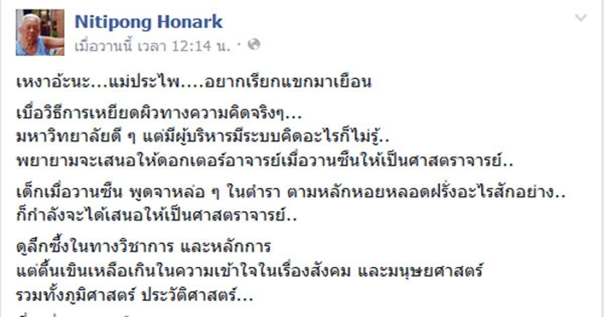 เมื่อวันที่ 10 สิงหาคม 2557 ดี้ นิติพงษ์ ห่อนาค นักแต่งเพลงชื่อดัง ได้โพสต์เฟซบุ๊กส่วนตัว Nitipong Honark กล่าวถึงมหาวิทยาลัยชื่อดังแห่งหนึ่งว่า ผู้บริหารมีระบบความคิดอะไรก็ไม่รู้ ถึงได้พยายามจะเสนอให้ดอกเตอร์อาจารย์เมื่อวานซืนให้เป็นศาสตราจารย์ ทำเอาหลายคนสงสัยว่า ดี้ นิติพงษ์ ตั้งใจโพสต์เฟซบุ๊กสื่อถึงใครหรือเปล่า โดยข้อความดังกล่าว มีดังนี้