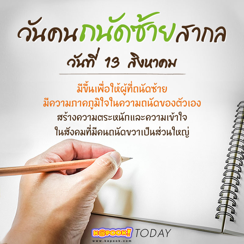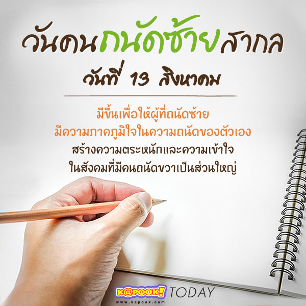 วันคนถนัดซ้ายสากล ตรงกับวันที่ 13 สิงหาคม ของทุกปี เป็นอีกหนึ่งวันสำคัญของโลก โดยเริ่มมีมาตั้งแต่ปี 1976 (พ.ศ. 2519) ซึ่งวันคนถนัดซ้ายสากล มีประวัติความเป็นมา และความสำคัญอย่างไร วันนี้เรามีข้อมูลมาฝาก