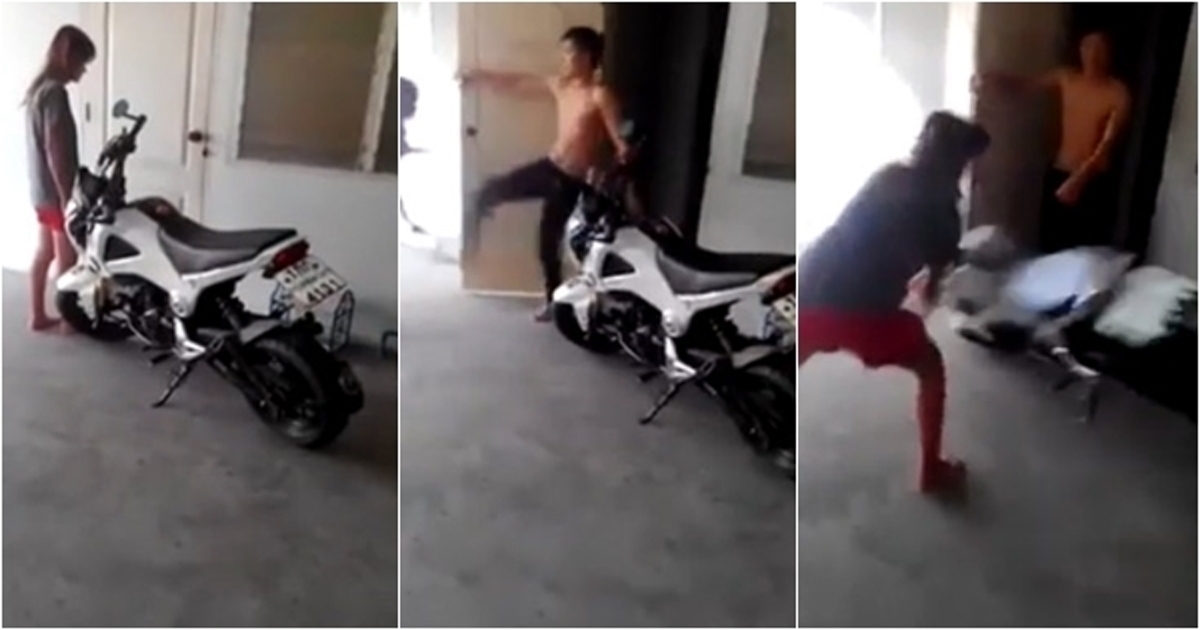 คลิปผัวนอกใจ เมียทุ่มรถ แชร์ว่อน เผยภาพฝ่ายหญิงสุดฉุนฝ่ายชายมีกิ๊ก ไม่ยอมออกมาคุยด้วย เหวี่ยงรถมอเตอร์ไซค์ที่จอดอยู่หน้าห้องล้มซะเลย