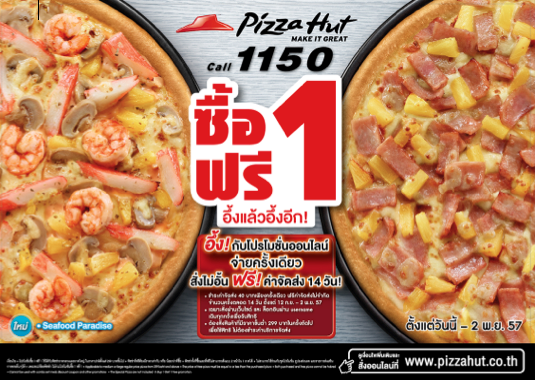 อึ้งแล้วอึ้งอีก! กับ พิซซ่าฮัท ซื้อ 1 ฟรี 1 อึ้งแรก! กับความคุ้มค่า ให้คุณอิ่มเว่อร์กับพิซซ่าถึง2 ถาด ในราคาแค่ถาดเดียว เริ่มต้นเพียง 299 บาท อึ้งกันต่อ! กับซีฟู้ดหน้าใหม่และอีกหลากหลาย