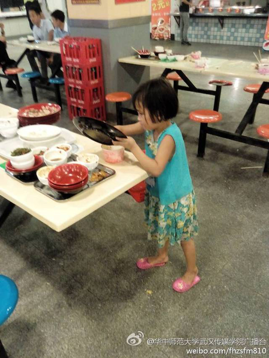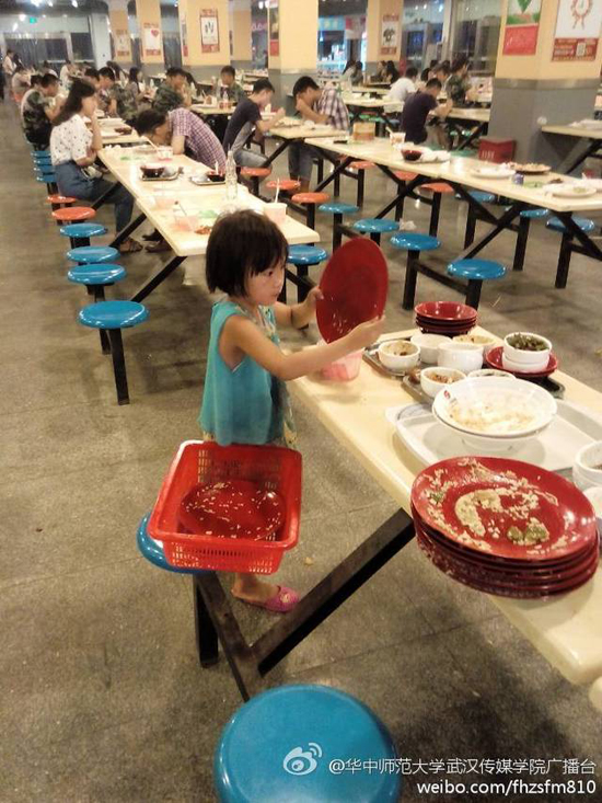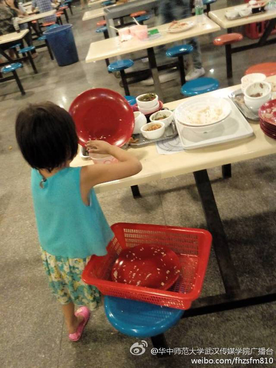 วันที่ 17 กันยายน 2557 เว็บไซต์เซี่ยงไฮ้อิสต์ ได้เผยภาพของเด็กหญิงวัย 6 ขวบ ที่กำลังเก็บจานชามที่ถูกวางทิ้งไว้บนโต๊ะภายในโรงอาหารของวิทยาลัยสื่อและการสื่อสารอู่ฮั่น ที่มหาวิทยาลัยฮวาจง ซึ่งกำลังเป็นภาพที่แพร่หลายในสื่อออนไลน์ของจีนขณะนี้ และทำให้นักศึกษาถึงกับละอายเลยทีเดียว ที่ไม่ยอมเก็บจานชามของตัวเองหลังจากทานเสร็จ