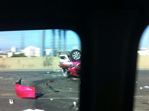 แท็กซี่-รถตู้-กระบะ ชนกระจาย ! พลิกคว่ำบนโทลเวย์