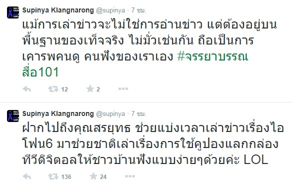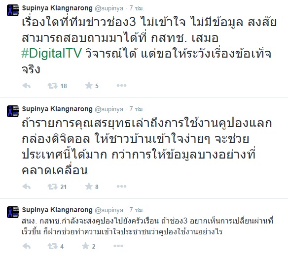 ทั้งนี้ นางสาวสุภิญญา ได้โพสต์ข้อความลงในทวิตเตอร์ว่า "ถ้ารายการคุณสรยุทธเล่าถึงการใช้งานคูปองแลกกล่องดิจิตอล ให้ชาวบ้านเข้าใจง่าย ๆ จะช่วยประเทศนี้ได้มากกว่าการให้ข้อมูลบางอย่างที่คลาดเคลื่อน เรื่องใดที่ทีมข่าวช่อง 3 ไม่เข้าใจ ไม่มีข้อมูล สงสัย สามารถสอบถามมาได้ที่ กสทช. เสมอ วิจารณ์ได้ แต่ขอให้ระวังเรื่องข้อเท็จจริง แม้การเล่าข่าวจะไม่ใช่การอ่านข่าว แต่ต้องอยู่บนพื้นฐานของข้อเท็จจริง ไม่มั่วเช่นกัน ถือเป็นการเคารพคนดู คนฟังของเราเอง
