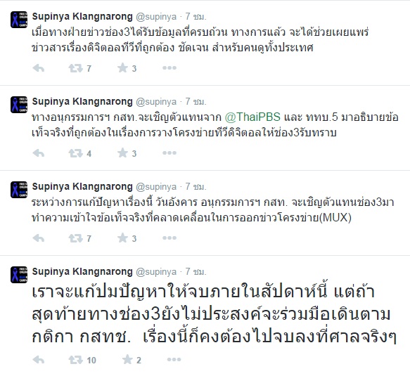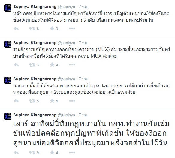 นอกจากนี้ นางสาวสุภิญญา ยังโพสต์ข้อความว่า ขณะนี้ทาง กสทช. กำลังทำงานเข้ม เพื่อปลดล็อกทีวีดิจิตอลของช่อง 3 หลังจากที่จอดำมากว่า 15 วัน อีกทั้งยังมีการเสนอแพ็คเกจเพื่อเยียวยาช่องที่ออกคู่ขนานและดูแลช่องใหม่อย่างเป็นธรรม รวมทั้งแก้ไขเรื่องโครงข่าp MUX ล่ม ทั้งในระยะสั้นและระยะยาว โดยทาง กสทช. จะเชิญตัวแทนจากช่อง 3 ช่อง 7 และช่อง 9 และช่องใหม่ดิจิตอล มาประชุมร่วมกันเพื่อแก้ปัญหาในวันอังคารนี้