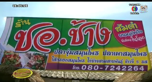 วันนี้ (23 กันยายน 2557) ที่รายการเรื่องเล่าเช้านี้ ทางช่อง 3 รายงานว่า ร้านขายส้มตำร้านหนึ่งผุดไอเดียตำส้มตำบนหลังช้าง ที่บริเวณแยก อ.จอมพระ จ.สุรินทร์ ชื่อร้าน ชอ.ช้าง พร้อมขึ้นข้อความรับประกันว่าไม่อร่อยยินดีคืนเงิน เจ้าของร้านคือ คุณประดับ สืบสันต์ ทนายความชื่อดัง โดยร้านนี้มีเอกลักษณ์ของตัวเองโดยการให้แม่ครัวขึ้นไปตำส้มตำบนหลังช้างปูนปั้นขนาดเท่าของจริงที่นำมาตั้งไว้ในร้าน และเวลานำไปเสิร์ฟให้ลูกค้าก็ไม่ได้ใส่จานเหมือนเช่นร้านอื่น แต่กลับนำทั้งครกไปเสิร์ฟแทน แถมราคายังถูกเพียง 30 บาททุกครก และมีชื่อเมนูสุดแปลก อาทิ ส้มตำบนหลังช้าง ตำไทยใจถึง ตำปูแซ่บเวอร์ ตำปูปลาร้าน้ำตาไหล ตำมั่วน้ำลายพุ่ง ฯลฯ