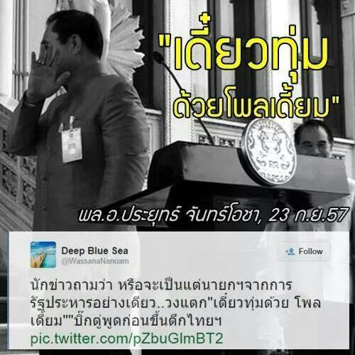 เพียงไม่กี่ชั่วโมง คำพูดของ พล.อ. ประยุทธ์ จันทร์โอชา นายกรัฐมนตรี ก็กลายเป็นวลีฮิตที่ติดแท็กกันทั่วบ้านทั่วเมืองเลยทีเดียว สำหรับประโยคที่ว่า "ทุ่มด้วยโพเดี้ยม" ซึ่งที่มาของประโยคนี้เกิดขึ้นที่ทำเนียบรัฐบาล เมื่อเวลา 14.00 น. ของวันนี้ (23 กันยายน 2557)