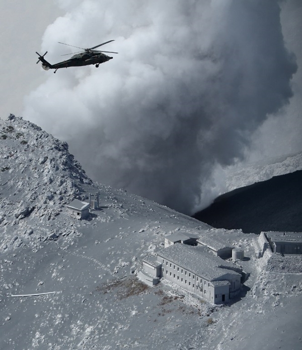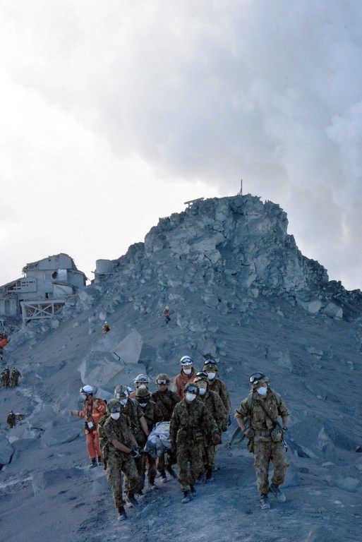 ขณะที่สำนักข่าวเอเอฟพี ก็ได้เปิดเผยภาพถ่ายการปฏิบัติการช่วยเหลือนักปีนเขาที่ติดอยู่บนภูเขาไฟออนตาเกะ โดยจะเห็นว่าพื้นที่บริเวณโดยรอบภูเขาไฟกลายเป็นสีขาวเทา จากเถ้าถ่านภูเขาไฟที่ปกคลุมอยู่เต็มพื้นที่ หนาหลายนิ้วเลยทีเดียว