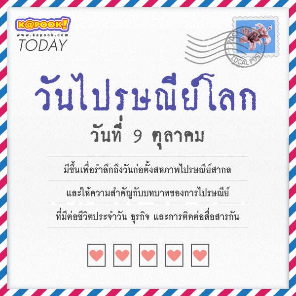 และด้วยเหตุที่ไปรษณีย์ไทยยังได้รับความนิยม ทางบริษัท ไปรษณีย์ไทย ก็ถือโอกาสในวันที่ 9 ตุลาคม ซึ่งเป็น วันไปรษณีย์โลก (World Post Day) ให้ประชาชนทุกคนสามารถนำจดหมายและโปสการ์ดส่งฟรี ณ ที่ทำการไปรษณีย์ทุกแห่งทั่วประเทศไทย นอกจากนี้ยังจัดทำไปรษณียากรชุดพิเศษขึ้นมาเพื่อจัดจำหน่ายเป็นที่ระลึกภายในงาน เพื่อเป็นการเฉลิมฉลองวันดังกล่าวด้วย ส่วนในวันนี้เราก็ขออาสาพาเพื่อน ๆ ทุกคนมารู้จักกับประวัติวันไปรษณีย์โลกกันสักหน่อย ว่ามีที่มาอย่างไร แล้วไปรษณีย์เริ่มใช้ในประเทศไทยตอนไหน...มาดูกันเลย