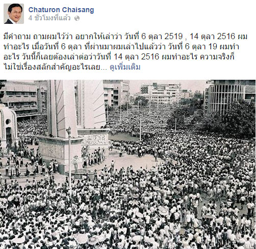 วันนี้ (14 ตุลาคม 2557) นายจาตุรนต์ ฉายแสง แกนนำพรรคเพื่อไทย ได้โพสต์ข้อความผ่านเฟซบุ๊ก Chaturon Chaisang เล่าเรื่องราวของตัวเองว่าระหว่างที่เกิดเหตุการณ์ 14 ตุลาคม 2516 ตนเองนั้นทำอะไรอยู่.. ดังนี้..