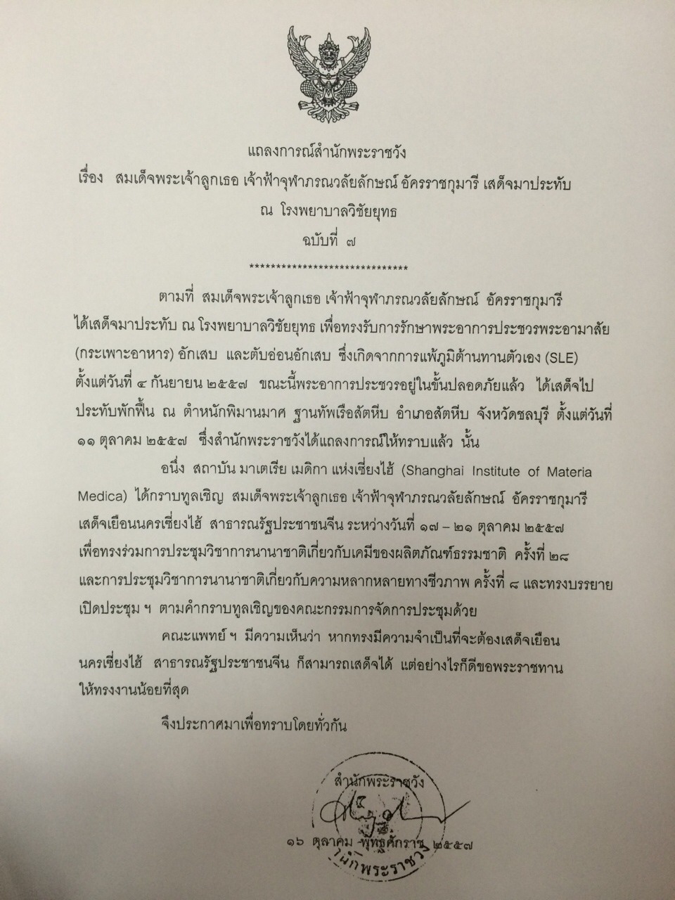 สำนักพระราชวังออกแถลงการณ์เจ้าฟ้าหญิงจุฬาภรณ์ ฉบับที่ 7 ขณะนี้พระอาการประชวรอยู่ในขั้นปลอดภัยแล้ว และจะทรงเสด็จฯ เยือนนครเซี่ยงไฮ้ ประเทศจีน 17-21 ต.ค. นี้ เพื่อทรงร่วมงานการประชุมวิชาการนานาชาติ