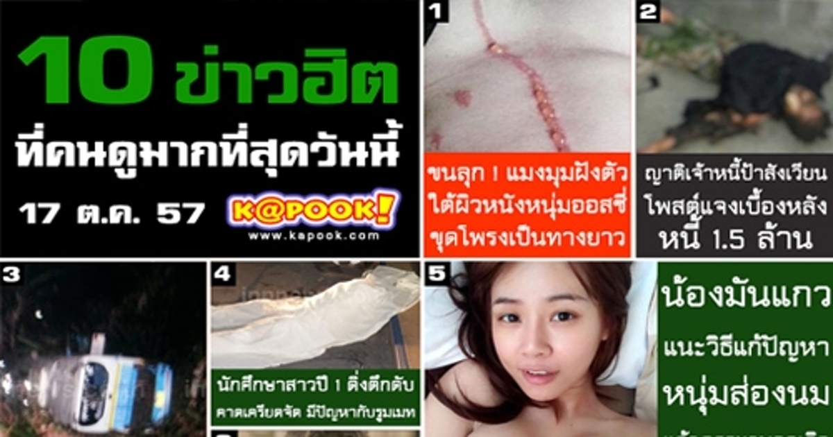 10 ข่าวฮิตประจำวันที่ 17 ตุลาคม 2557 เว็บ Kapook.com วันนี้ยังคงมีประเด็นข่าวที่น่าสนใจมากมาย ทั้งเรื่อง ญาติเจ้าหนี้ป้าสังเวียน โพสต์ชี้แจงเบื้องหลังหนี้ 1.5 ล้าน, แมงมุมฝังตัวใต้ผิวหนังหนุ่มออสซี่ ขุดโพรงเป็นทางยาว, แถมยังมีข่าวของ น้องมันแกว นมคุณธรรมด้วย ส่วนข่าวอื่น ๆ จะมีอะไรบ้าง ไปติดตามกันเลย