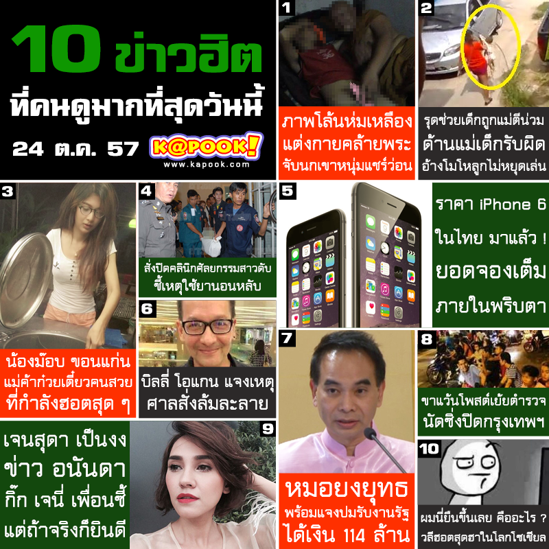 10 ข่าวฮิตที่คนดูมากที่สุด เว็บ Kapook.com ประจำวันที่ 24 ตุลาคม 2557 วันนี้ก็ยังคงมีประเด็นข่าวร้อน ๆ ที่น่าสนใจมากมาย อาทิ ราคา iPhone 6 ในไทย, บิลลี่ โอแกน ชี้แจงเหตุศาลสั่งล้มละลาย, น้องม๊อบ แม่ค้าก๋วยเตี๋ยวสุดฮอต พร้อมเฉลย ผมนี่ยืนขึ้นเลย คืออะไร ตามไปชมกันค่ะ