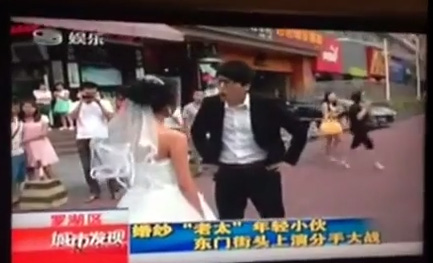 เมื่อวันที่ 24 ตุลาคม 2557 สำนักข่าวจีนได้นำเสนอคลิปข่าวคู่บ่าวสาวคู่หนึ่ง ซึ่งฝ่ายเจ้าสาวได้สวมชุดแต่งงาน แต่แต่งหน้าแก่ เพื่อพิสูจน์รักแท้กับเจ้าบ่าว อย่างไรก็ตาม ทางฝ่ายเจ้าบ่าวไม่พอใจ ไล่ให้ไปแต่งหน้าใหม่ ทั้งคู่จึงทะเลาะกันกลางถนน ท่ามกลางสายตาคนรอบข้างที่มุงดูว่าเกิดอะไรขึ้น สุดท้าย ฝ่ายเจ้าบ่าวได้ถอดแว่นตาตัวเอง เขวี้ยงลงพื้น ก่อนที่จะเดินหนีไป ทิ้งเจ้าสาวให้ร้องไห้อยู่กลางถนน ขณะเดียวกัน ผู้คนรอบข้างก็ได้นำทิชชู่มามอบให้เจ้าสาว เพื่อซับน้ำตาด้วย