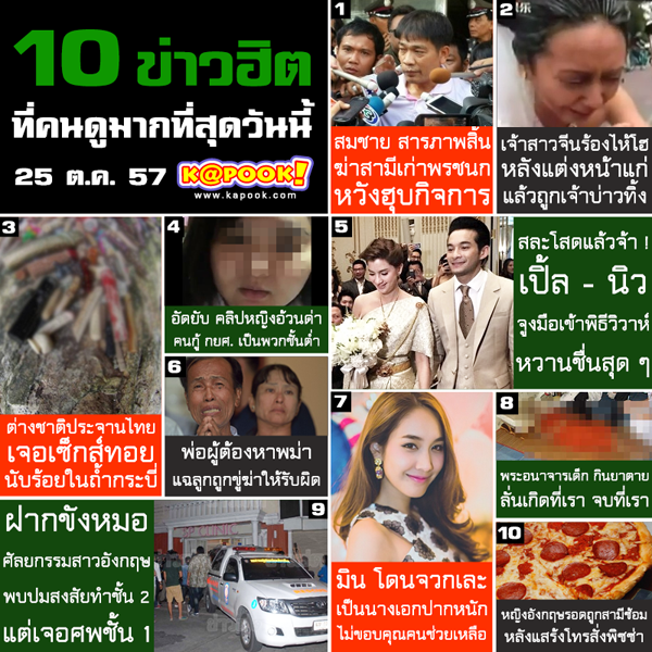 10 ข่าวฮิตที่คนดูมากที่สุด เว็บ Kapook.com ประจำวันที่ 25 ตุลาคม 2557 วันนี้ก็ยังคงมีประเด็นข่าวร้อน ๆ ที่น่าสนใจมากมาย มาตามไปชมกันค่ะ