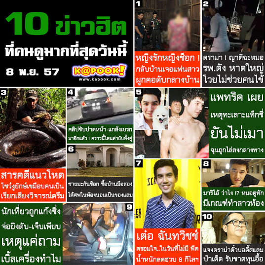 ในวันนี้ (8 พฤศจิกายน 2557) แวดวงข่าวมีประเด็นฮอตและประเด็นร้อนมากมาย ทั้งประเด็นสุดสยองอย่าง รายการสารคดีแนวโหด โชว์งูยักษ์เขมือบคนเป็น ๆ รวมไปถึงเรื่องราวของหญิงรักหญิง ที่อีกฝ่ายน้อยใจผูกคอตาย นอกจากนี้ ยังมีดราม่าอีกเพียบ ทั้งประเด็นดราม่าญาติโวยหมอ บอกไม่ช่วยรักษาคนไข้ เพราะมัวแต่แจงสิทธิประกันสังคม นอกจากนี้ ยังมีประเด็นเด็ด ๆ อีกเพียบ..