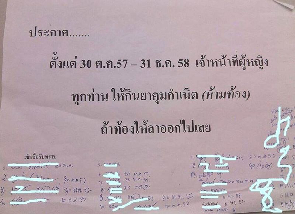 วันนี้ (9 พฤศจิกายน 2557) โลกออนไลน์ได้เกิดกระแสวิพากษ์วิจารณ์ กรณีมีโรงพยาบาลแห่งหนึ่งย่านอนุสาวรีย์ชัยสมรภูมิ ได้ติดประกาศป้ายไว้ที่แผนกจ่ายยาของโรงพยาบาล ระบุว่า "ประกาศ.... ตั้งแต่ 30 ต.ค.57- 31 ธ.ค.58 เจ้าหน้าที่ผู้หญิงทุกท่านให้กินยาคุมกำเนิด (ห้ามท้อง) ถ้าท้องให้ลาออกไปเลย" โดยในประกาศดังกล่าว ยังให้เจ้าหน้าที่เซ็นชื่อรับทราบในแผ่นประกาศด้วย และมีเจ้าหน้าที่ผู้หญิงเซ็นชื่อรับทราบพร้อมกำกับวันเดือนปีที่ลงชื่อแล้วกว่า 30 คน