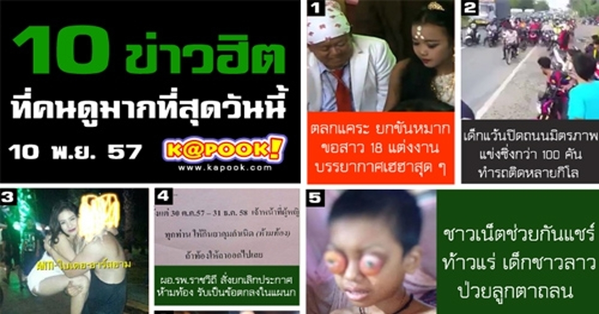 10 ข่าวฮิตที่คนดูมากที่สุด เว็บ Kapook.com ประจำวันที่ 10 พฤศจิกายน 2557 ประเด็นข่าวฮิตอันดับ 1 วันนี้ ตลกแคระ ยกขันหมากขอสาว 18 แต่งงาน แล้วยังมีประเด็นฮอตอีกมากมาย อาทิ เด็กแว้นปิดถนนมิตรภาพ, ภาพแฉ ใบเตย อาร์สยาม, รพ.ราชวิถี รับประกาศห้ามท้อง เป็นข้อตกลงในแผนก และยังมีประเด็นน่าสนใจอีกเพียบ ดังนี้