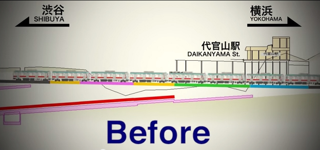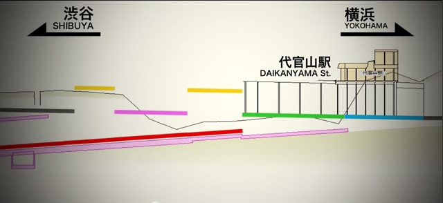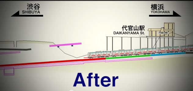 - ภาพหลังการปรับระดับ เมื่อรางรถไฟจากสถานีไดกันยาม่า เชื่อมต่อกับรางของสถานีชิบุยะ ที่ใต้ดินชั้น 5