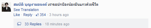 นอกจากนั้น บก.ลายจุด หรือนายสมบัติ บุญงามอนงค์ นักกิจกรรมประชาธิปไตยคนดัง ก็ได้มาร่วมคอมเม้นท์ว่า "เราขอปกป้องน้องมันแกวด้วยชีวิต"