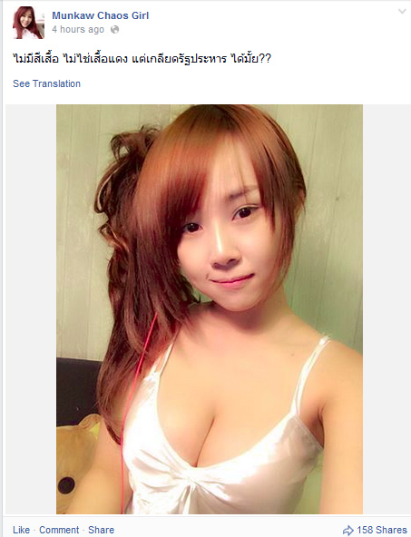 สำหรับตัวอย่างคอนเม้นท์ อาทิ ถูกแล้วลูก ถูกแล้วลูก ใครบังอาจเถียง ตายไปพระเจ้าไม่ให้ขึ้นสวรรค์แน่ๆ ลูกเอ้ย ลงนรกสถานเดียว, ยินดีด้วยค่ะ คุณได้เป็นควายแดงเรียบร้อยแล้ว ใครไม่ชอบรัฐประหาร พวกเขาก็ยัดเยียดความเป็นควายแดงขี้ข้าแม้วให้แล้วค่ะ โดย Parkizz, แกวจะเอาเรื่องการเมืองมาเป็นประเด็นทำไมนะ โชว์นมมันเป็นบุญอยู่แล้ว แต่สร้างบาปความแตกแยกทางความคิด มันเป็นบาปนะ อยู่เฉยๆไปซะเถอะดีแล้ว เดี๋ยวจะมีผลกระทบทางด้านการงานการเงินเอาใด้นะ, ดราม่าทันทีถ้ามีการเมืองคนไทย.....ผมก็ไม่ใช่สลิ่ม ไม่มีสีเสื้อ แต่ชอบรัฐบาล ประยุทธ์ เด็ดขาดดี, เพจน้องมีคนติดตามเยอะ อย่าโพสต์เรื่องที่ทำให้คนทะเลาะกันจะดีกว่าค่ะ, หมดอนาคตล่ะอีหนู ต่อจากนี้โพสต์อัไรโดนเหยียบจมดิน เพราะฝ่ายคนที่ชอบ...มีเยอะและพร้อมจะวอร์ทุกเมื่อ แล้วจะมีเพจแอนตี้ตามมา พี่รู้พี่เรียนมา, จบไปนานละนะคะน้อง ยังรื้อมาพูดอีก เป็นไรมากป่ะ