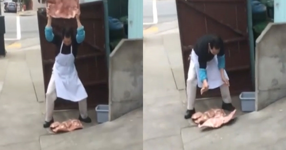 ร้านอาหารจีนในสหรัฐฯ เอาเนื้อหมูมาฟาดให้นุ่มบนทางเท้า