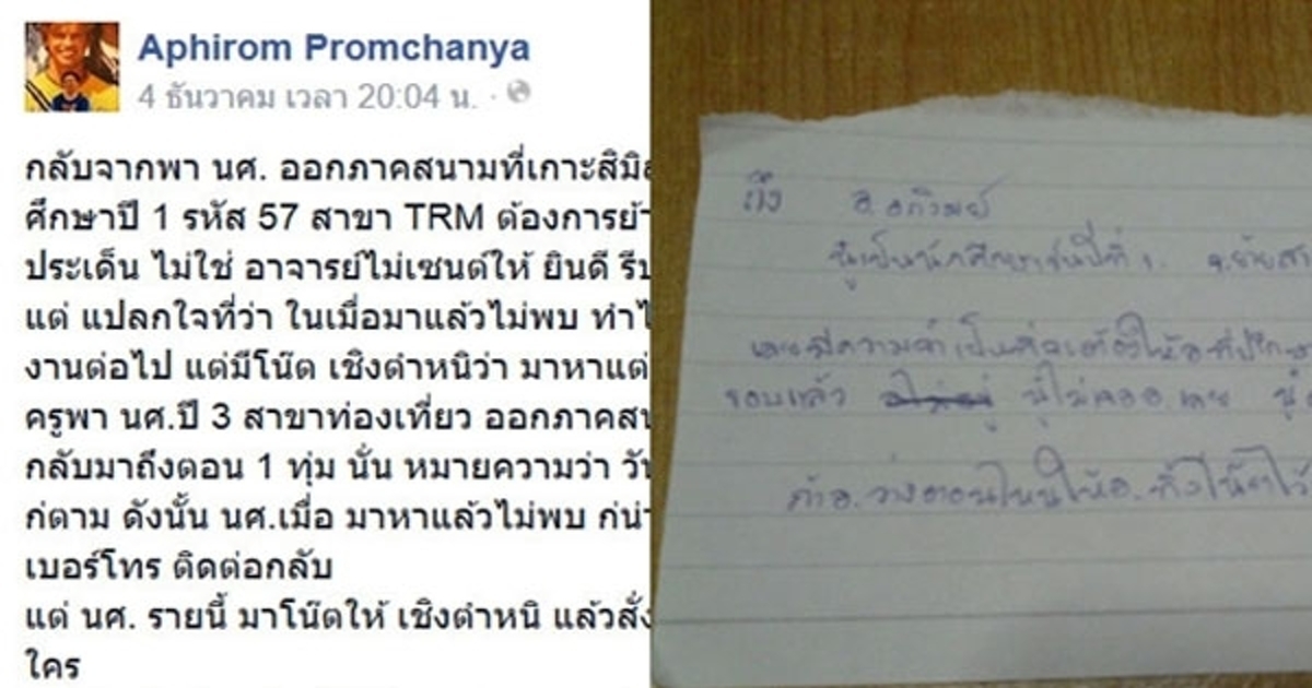 จากนั้นอาจารย์ได้โพสต์ข้อความลงในเฟซบุ๊กตัวเอง ระบุว่า "กลับจากพา นศ. ออกภาคสนามที่เกาะสิมิลัน ได้รับเศษกระดาษโน้ตจากนักศึกษาปี 1 รหัส 57 สาขา TRM ต้องการย้ายสาขาไปเรียนสาขาการบริการ ประเด็นไม่ใช่อาจารย์ไม่เซ็นให้ ยินดีรีบเซ็นให้ด่วนเลยครับ แต่แปลกใจที่ว่าในเมื่อมาแล้วไม่พบ ทำไมไม่ติดต่อเจ้าหน้าที่เพื่อประสานงานต่อไป แต่มีโน้ตเชิงตำหนิว่า มาหาแต่ไม่พบ อยากจะเรียนเพื่อทราบ วันนี้ครูพา นศ. ปี 3 สาขาท่องเที่ยว ออกภาคสนามครับ ไปสิมิลัน ตั้งแต่เช้าตรู่ เพิ่งกลับมาถึงตอน 1 ทุ่ม นั่นหมายความว่า วันนี้ครูมีงานข้างนอกหรือวันอื่น ๆ ก็ตาม